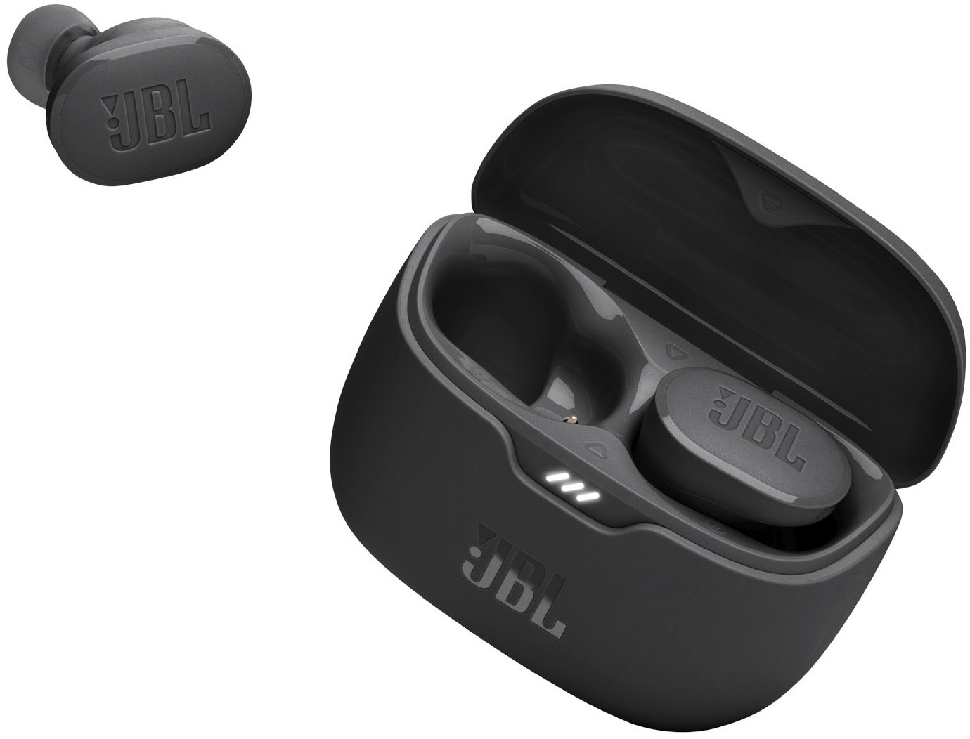 Das Ladecase der JBL Tune Buds ist nicht nur eine praktische Aufbewahrungsmöglichkeit, sondern auch ein stilvolles Accessoire. Es ist klein, leicht und kompakt und passt problemlos in jede Tasche. Das Ladecase verfügt über ein elegantes Design in Schwarz und ist mit dem JBL-Logo versehen.