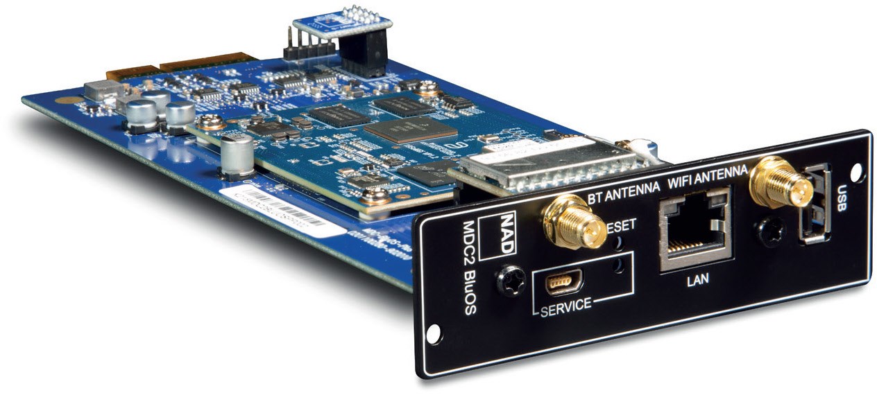 Das NAD MDC2 BluOS-D Modul ist eine Erweiterungskarte für den NAD C399 Verstärker. Es verwandelt Ihren Verstärker in eine hochmoderne Streaming-Zentrale, die Ihnen Zugriff auf hochauflösendes Streaming, Multiroom-Audio und eine Vielzahl von Musikdiensten bietet. Wenn Sie Ihren NAD C399 um diese Funktionen erweitern möchten, ist das MDC2 BluOS-D Modul die ideale Lösung.